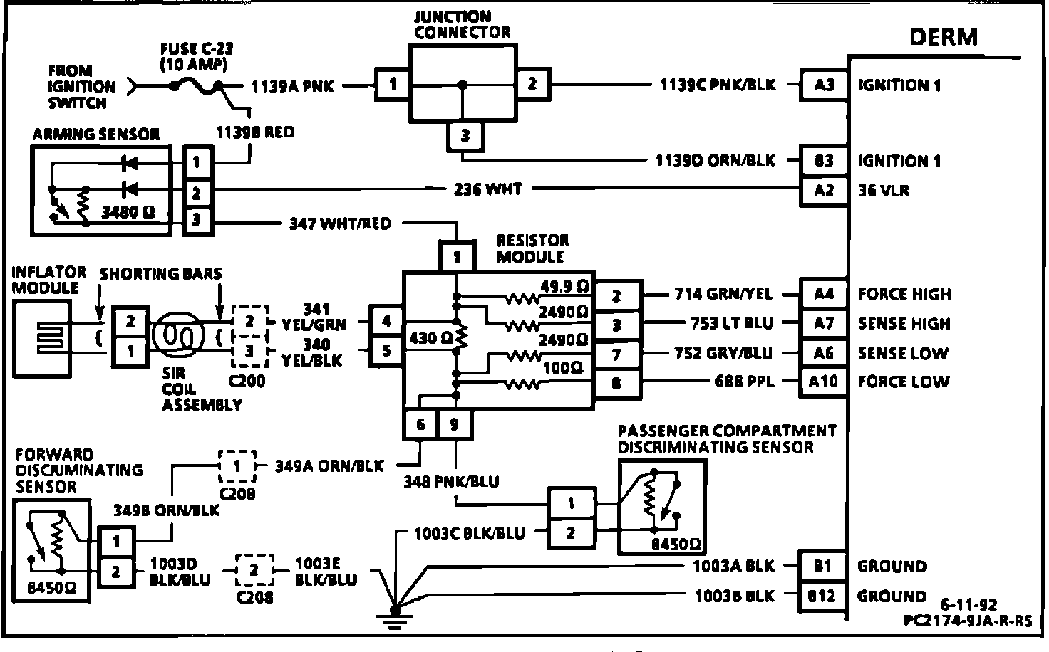 DTC 24 is set when the voltage at the "Sense Low" input, terminal "A6", is within a specific range of "36 VLR" output voltage for 500 milliseconds during the "Continuous Monitoring Tests" performed by the DERM. The "Continuous Monitoring Tests" are performed by the DERM after the initial "Turn-ON Tests" are completed and are performed every 100 milliseconds while "Ignition 1" voltage is present at the DERM. The "Continuous Monitoring Tests" check the continuity of the deployment loop from the "36 VLR" output of the DERM through the arming sensor, inflator module and the discriminating sensors to ground. DTC 24 will set if the arming sensor resistance is too high or open, a discriminating sensor is shorted or resistance is too low, the "Force High," "Sense Low" or "Force Low" circuits are shorted to ground or system voltage, or the "Sense High" circuit is shorted to ground.