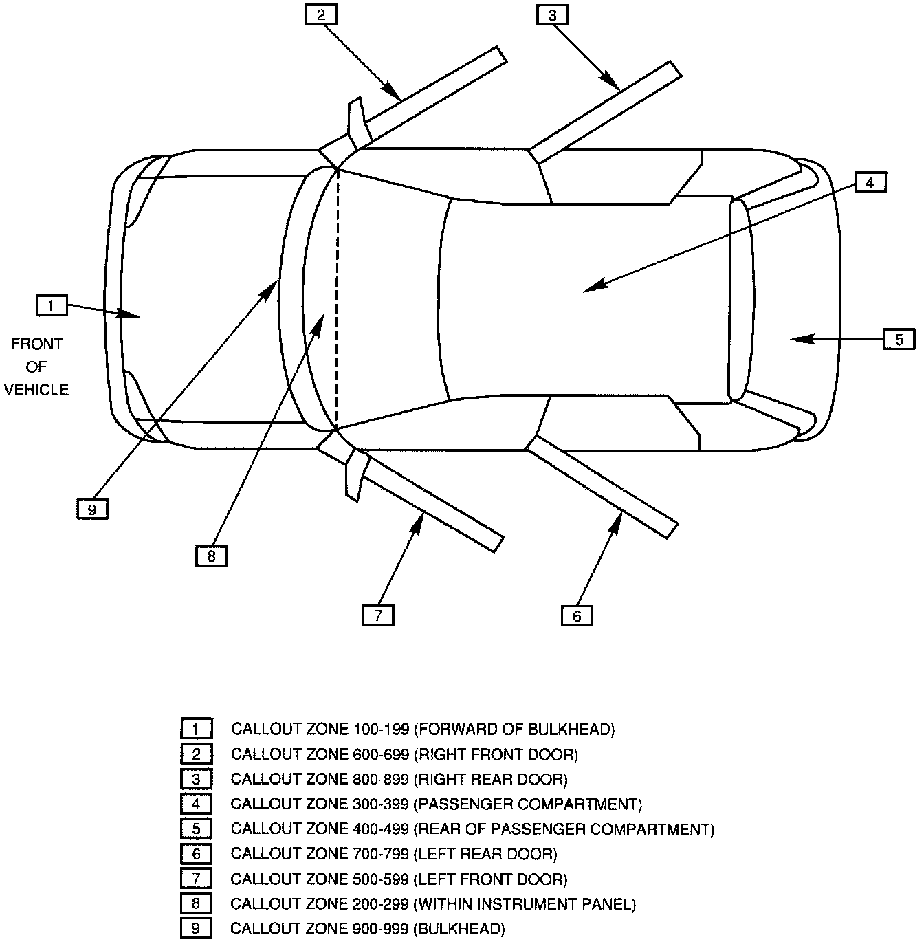 All connectors, grounds, splices and grommets are labeled with numbers which correspond to specific areas of the vehicle. These numbers will help you locate a connector, ground, splice or grommet in the vehicle. For example, connector C6O5 will be located somewhere in the right front door. For further information regarding these locations and labels, refer to the "Vehicle Zoning Callout Chart" (Figure 1).