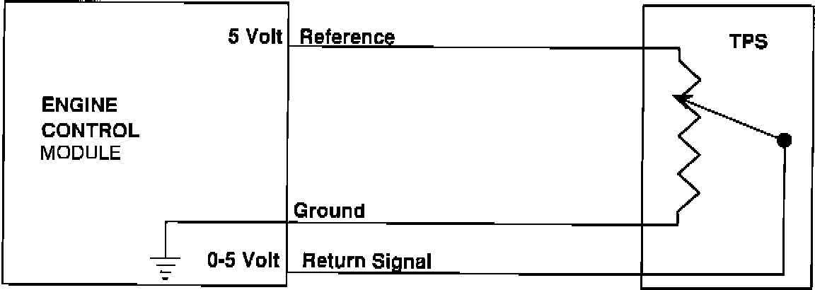 The Throttle Position Sensor (TPS) consisting of a contact point (idle switch) and a potentiometer is connected to the throttle valve shaft on the throttle body, and detects the throttle valve opening. The throttle opening in the idle state is detected by means of the contact point which turns "ON" in that state. But beyond that the full opening is detected by the potentiometer as follows. A 5-volt reference voltage is applied to the sensor from the ECM and as its brush moves over the resistance according to the throttle valve opening, the output voltage varies accordingly. By monitoring the "ON/OFF" signal and sensor output voltage, the ECM detects the throttle valve opening. The ECM uses the signal from the TPS as one of the signals to control (fuel injector, ISC solenoid valve and EGR VSV (if equipped). Also, the ECM converts the voltage signal from the TPS into "ON/OFF" signal and sends it to Transmission Control Module (TCM), where it is used as one of the signals to control the automatic transmission.