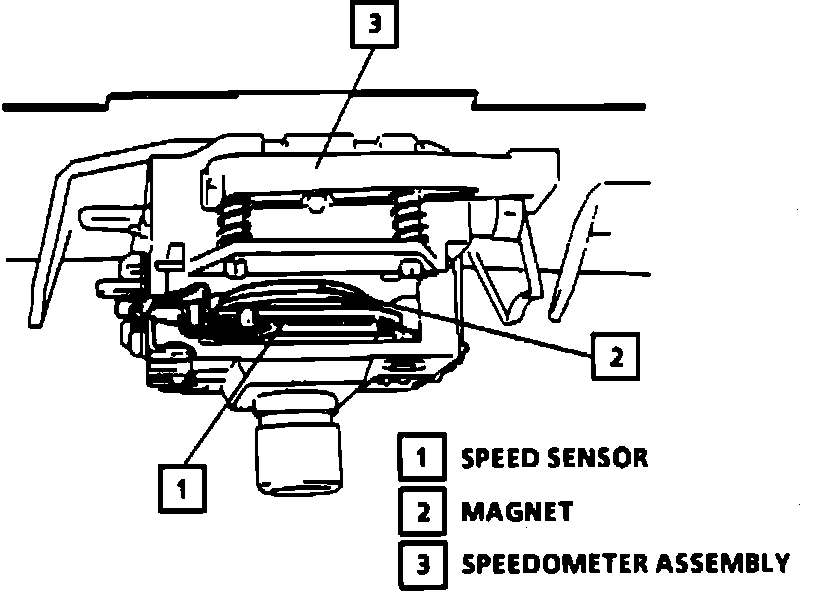 The Vehicle Speed Sensor (VSS) provides information to the ECM for control of idle speed and transmission converter clutch engagement as well as controlling canister purge of the fuel evaporative emission system. This signal is generated by a reed switch and magnet that is built into the speedometer. As the magnet turns with the speedometer cable, its magnetic force causes the reed switch to turn "ON" and "OFF." The VSS sends a pulsing voltage signal to the ECM, which the ECM converts to miles per hour.