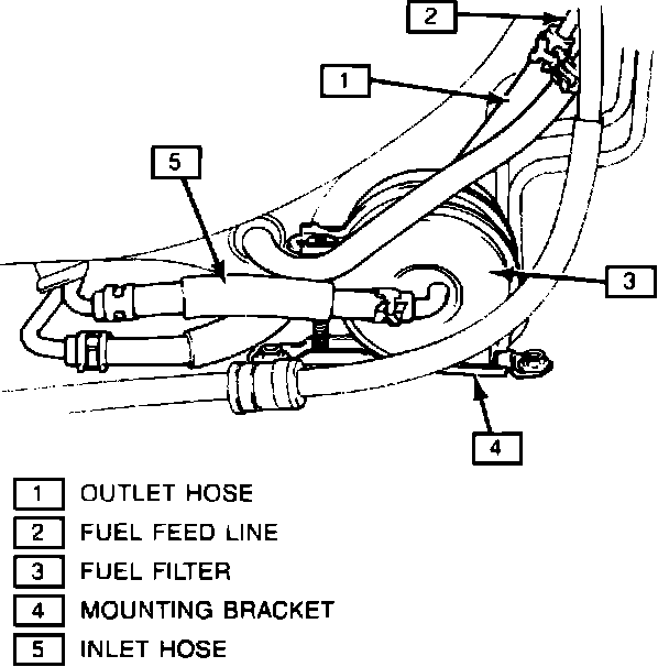 6. Remove fuel filter, mounting bracket, and outlet hose as an assembly from the vehicle.