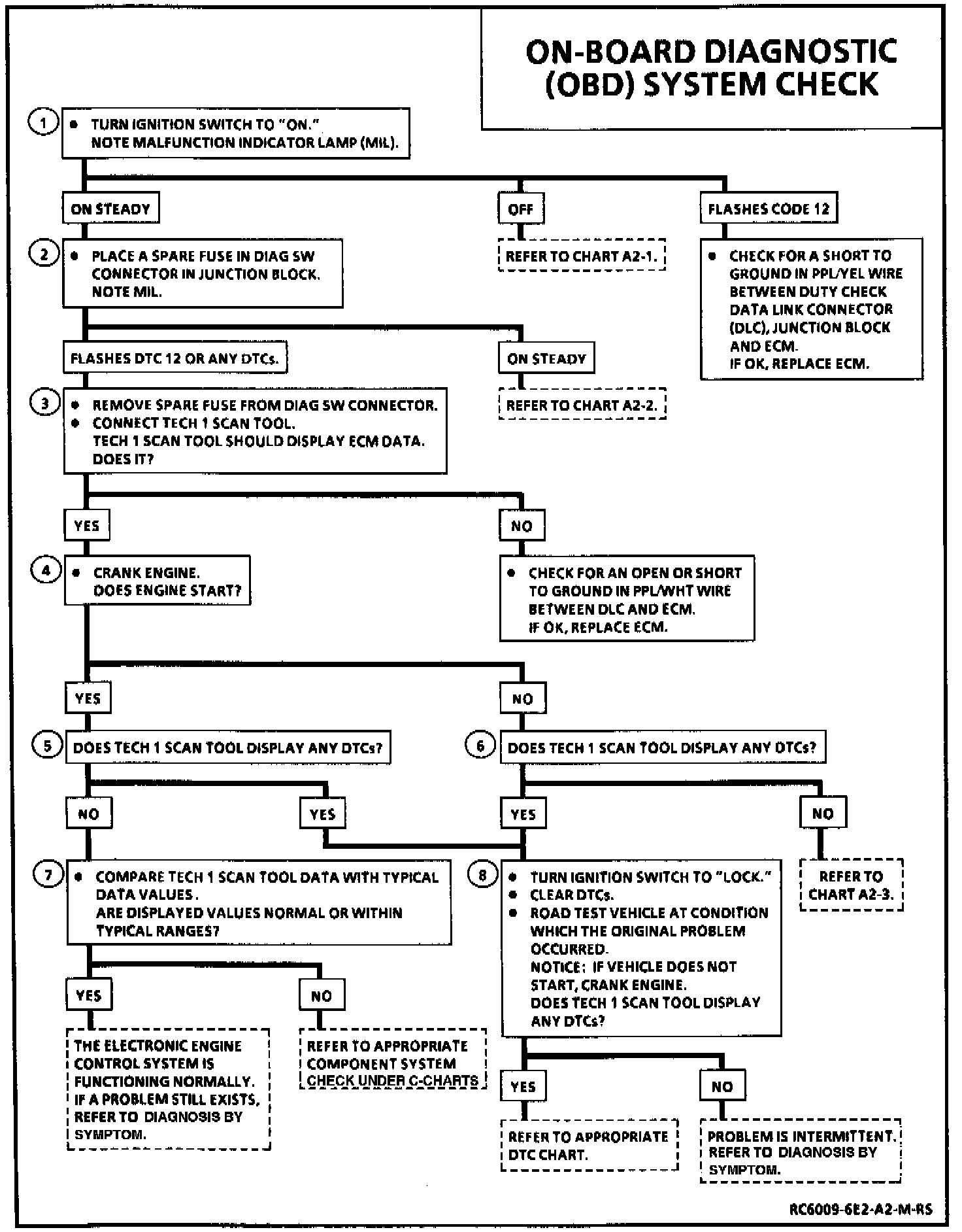 The On-Board Diagnostic System Check is an organized approach to identifying a problem created by an electronic engine control system malfunction. It must be the starting point for any driveability complaint diagnosis, because it directs the service technician to the next logical step in diagnosing the complaint. Understanding the chart and using it correctly will reduce diagnostic time and prevent the unnecessary replacement of good parts.