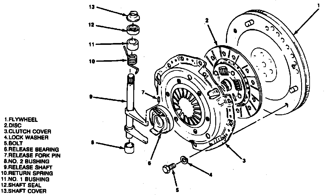 6. Reverse procedure to install. Lubricate splines of transaxle input shaft and pilot bearing surface and release bearing with lithium wheel bearing grease. Torque pressure plate attaching bolts to 17 ft. lbs.