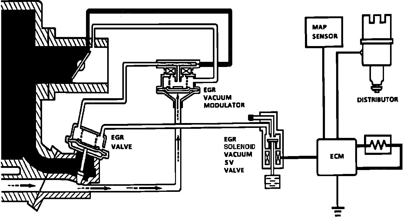 The EGR valve is controlled by the ECM through an EGR Solenoid Vacuum (SV) Valve and by exhaust back pressure acting on the modulator. Vacuum is allowed to the EGR valve on acceleration and shut "OFF" upon deceleration or idling. The valve mounted in the EGR modulator is operated by back pressure of the exhaust gas to open and close the modulator valve. By this opening and closing action of the modulator valve, the EGR modulator controls the vacuum transmitted to the EGR valve. Under a low load condition such as low speed driving, the exhaust pressure is low. In this state, the diaphragm in the EGR modulator is pushed down by the spring force and the modulator valve opens to allow the air into the vacuum passage from the outside. As a result, the vacuum transmitted to the EGR valve becomes smaller and so does the opening of the EGR valve, so a less amount of exhaust gas is recirculated to the intake manifold.