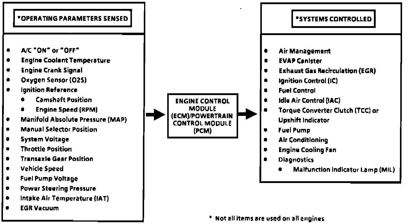 The computer command control system, which is controlled by the Electronic Control Module (ECM), is designed to maintain exhaust emission levels at federal standards while providing good driveability and fuel efficiency. The functions of the system are based on data gathered by sensors and switches located throughout the vehicle. The ECM maintains control over fuel delivery, ignition, idle air flow, the fuel pump and other system components, while monitoring the system for faulty operation with its diagnostic capabilities.
