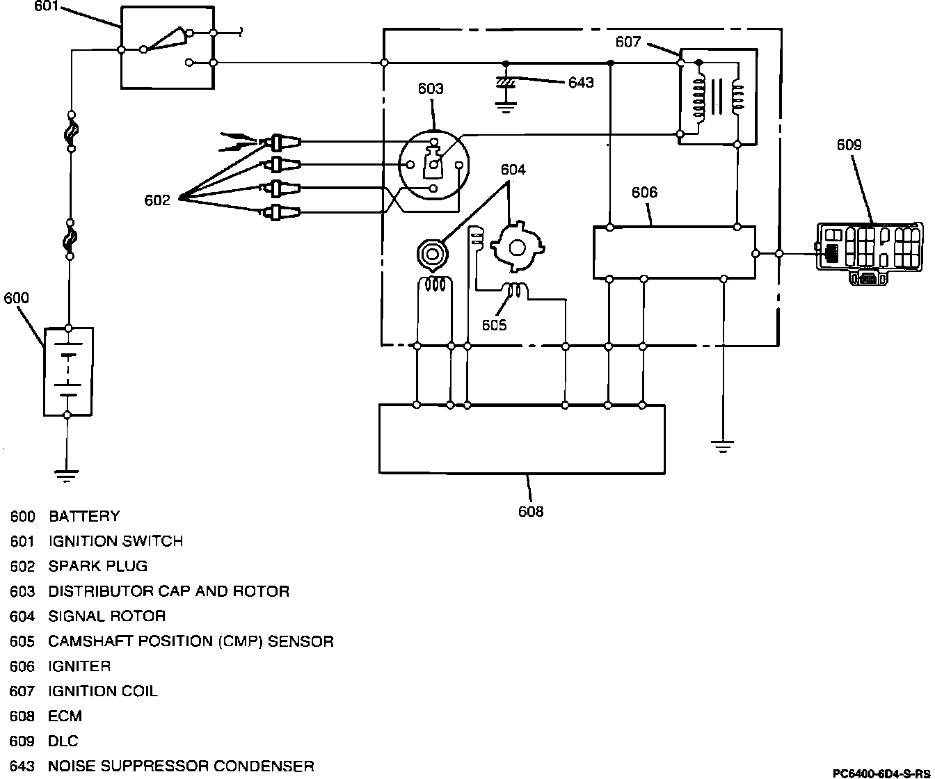 All spark timing changes in the distributor are performed electronically by the PCM. The PCM monitors information from various engine sensors, computes desired spark timing, and signals the distributor to change the timing accordingly. No vacuum or mechanical advance mechanisms are used. The ignition system also includes a noise suppressor condenser and noise suppressor filter to eliminate ignition sound. The noise suppressor filter also provides the tachometer with an ignition signal.