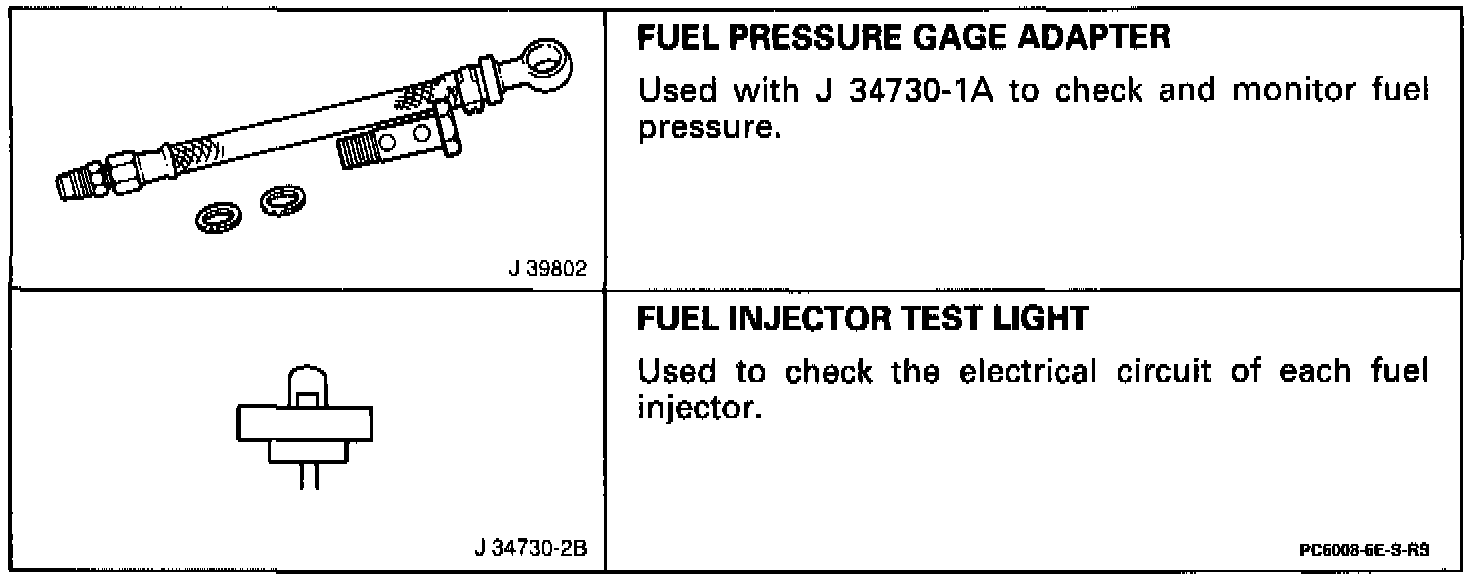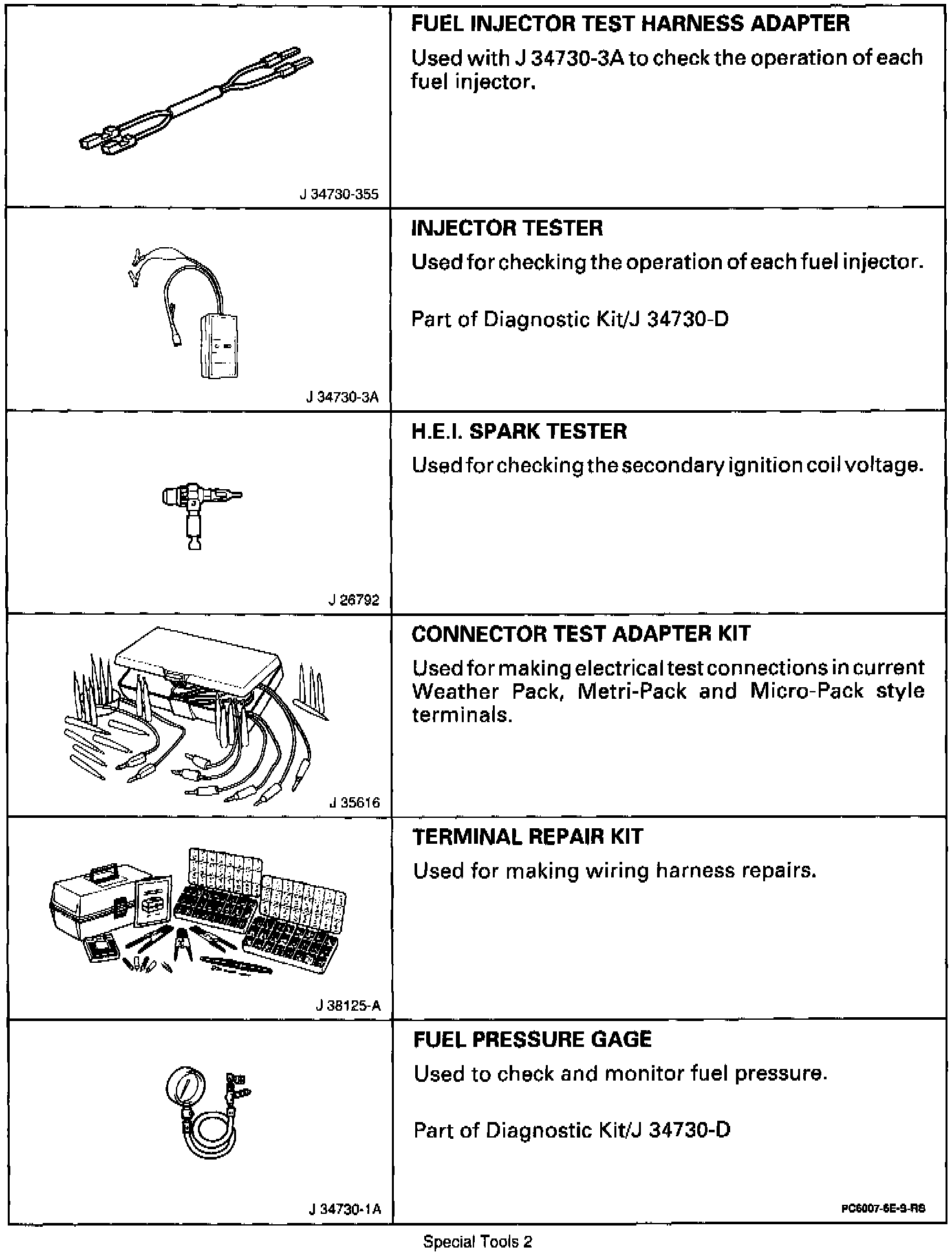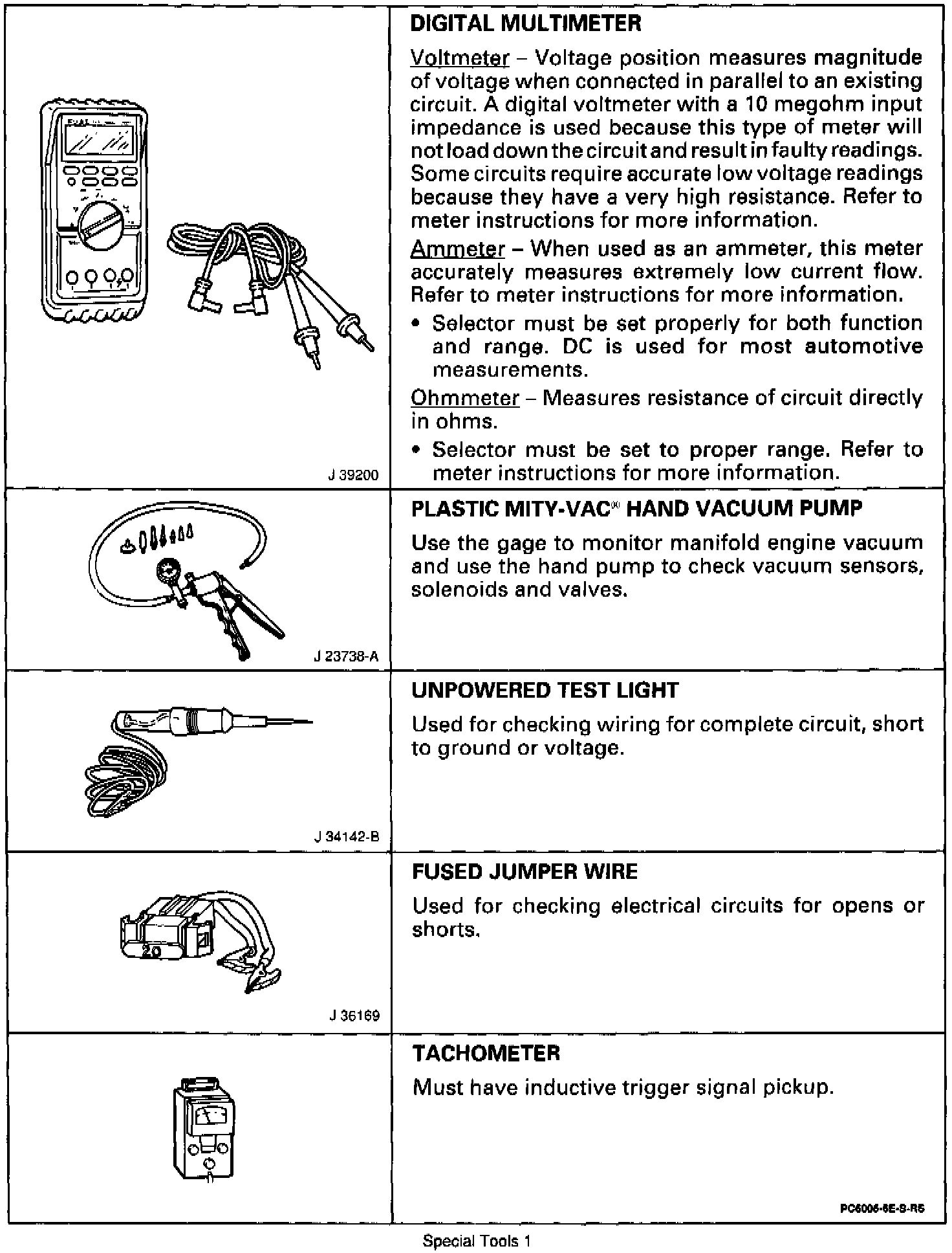 For a thorough diagnosis, the system requires a test light, a digital multimeter, a vacuum gage, a pressure gage, a tachometer and some fused jumper wires. A test light or digital multimeter must be used when specified in the diagnosis procedures. See accompanying illustrations for tool descriptions and part numbers.