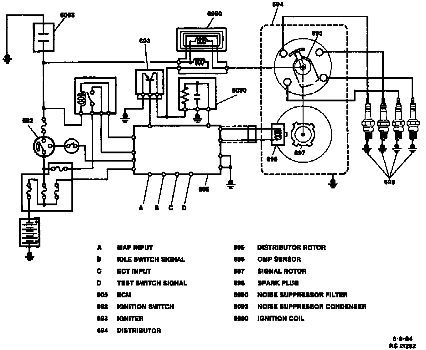 The ECM sends a signal to the igniter which is connected to the negative side of the ignition coil's primary circuit. When this signal is interrupted, the field around the primary coil collapses and a high voltage is induced in the secondary coil. The high voltage induced in the secondary coil is then forced to find a ground through the secondary (coil) wire, distributor cap, rotor, secondary (spark plug) wires and across the spark plug gap to the engine block.