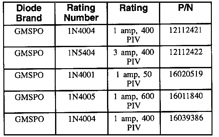 In the event 1 Amp, 50 PIV (Peak Inverse Rating) diodes are unavailable, a universal diode with a 1 Amp, 400 PIV rating can be used for the following applications: