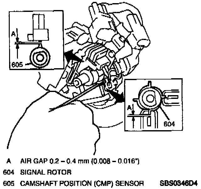 5. Air gap between the signal rotor and CMP sensor. If the air gap is not between 0.2-0.4 mm (0.008-0.016-inch), replace the distributor housing.