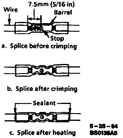 If the harness is taped, remove the tape. To avoid wire insulation damage, use a sewing "seam ripper" to cut open the harness (available from sewing supply stores). The crimp and seal splice sleeves may be used on all types of insulation except Tefzel and coaxial and may only be used to form a one-to-one splice.
