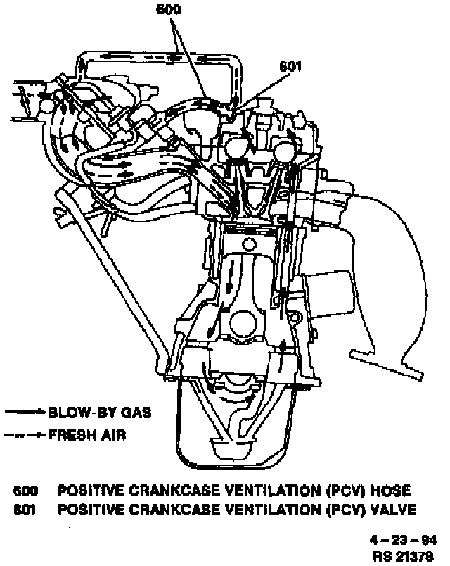 The PCV system is a metered orifice type which supplies vacuum from the intake plenum through a vacuum hose to a metered orifice in the valve cover. The PCV system draws out blow-by gases at a controlled rate.