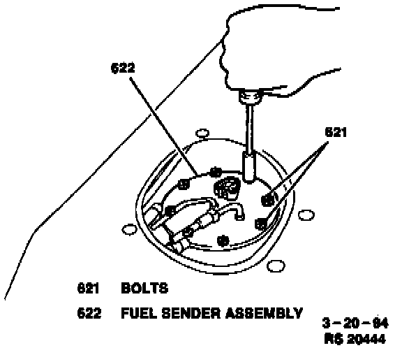 6. Eight bolts and fuel sender assembly from fuel tank (see image).