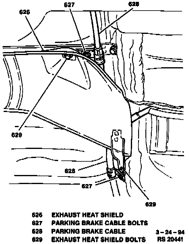 7. Parking brake cables to underbody; secure with two bolts. Tighten parking brake cable bolts to 30 Nm (22 lb. ft.).