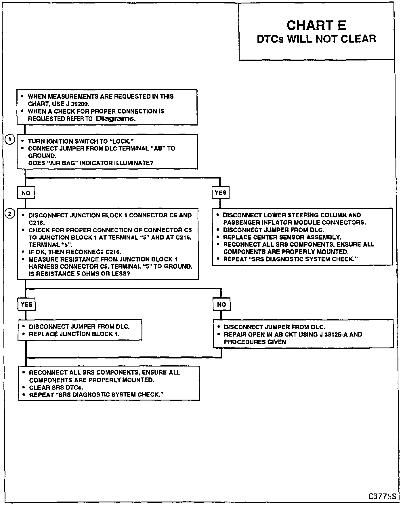 When system voltage is applied to the center sensor assembly, it will perform the primary check followed by the constant check When a fault is detected, the center sensor assembly will store a DTC and illuminate the "AIR BAG" indicator. When a DTC is stored, the safety circuit (inside the center sensor assembly) will open, preventing SRS operation. All faults must be repaired and all DTCs must be cleared before the safety circuit closes, allowing the SRS to function normally.