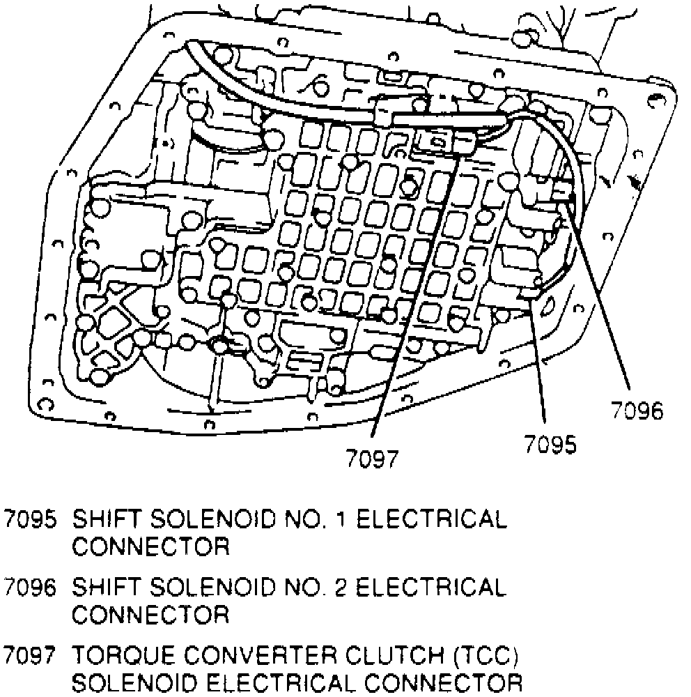 4. Remove filter and screen from valve body, then disconnect solenoid electrical connectors from shift solenoid Nos. 1 and 2 and TCC solenoid, Fig. 2 .