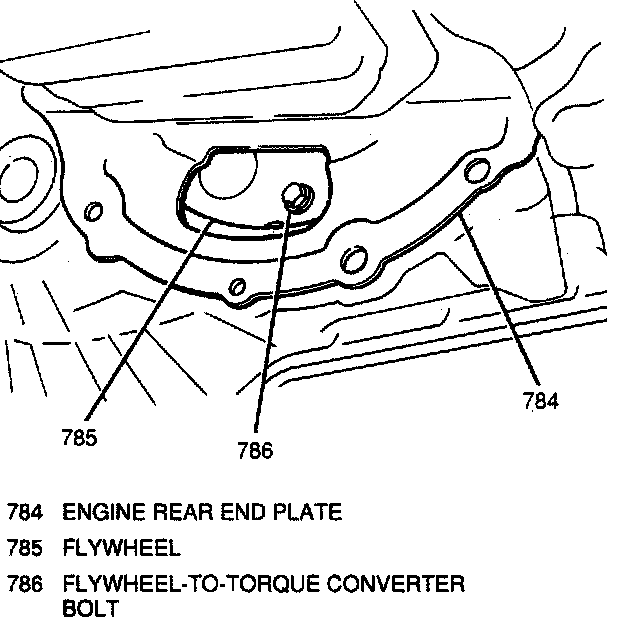 3. Six flywheel-to-torque converter bolts into flywheel.
