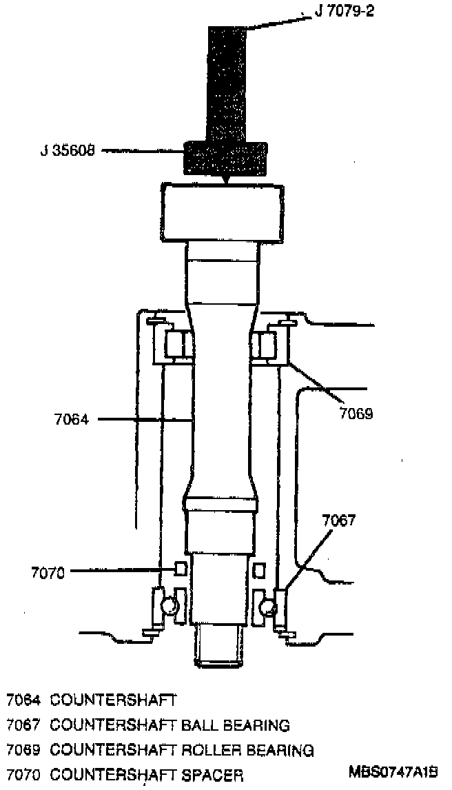 1. Countershaft into transaxle case. Using a J 35608 with a J 7079-2, insert the Countershaft into the transaxle case making sure the roller bearing spacer is in the correct position. Then tap the Countershaft into the transaxle case. DO NOT hammer excessively or damage to the transaxle case could result.