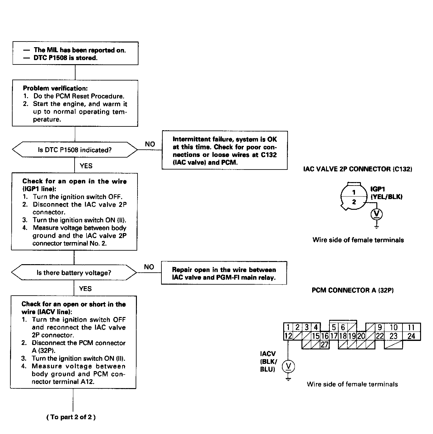 The scan tool indicates Diagnostic Trouble Code (DTC) P1508: A problem in the Idle Air Control (IAC) valve circuit.