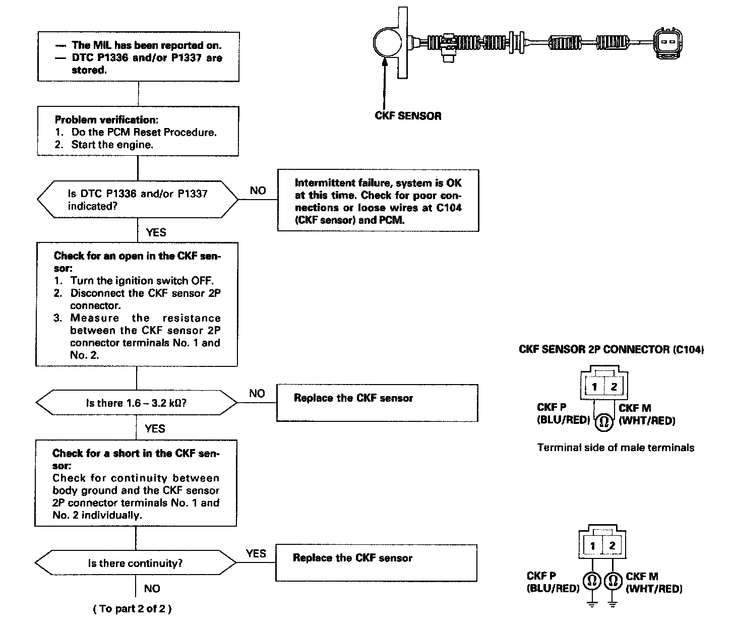 The scan tool indicates Diagnostic Trouble Code (DTC) P1336: Intermittent interruption in the Crankshaft Speed Fluctuation (CKF) sensor circuit.