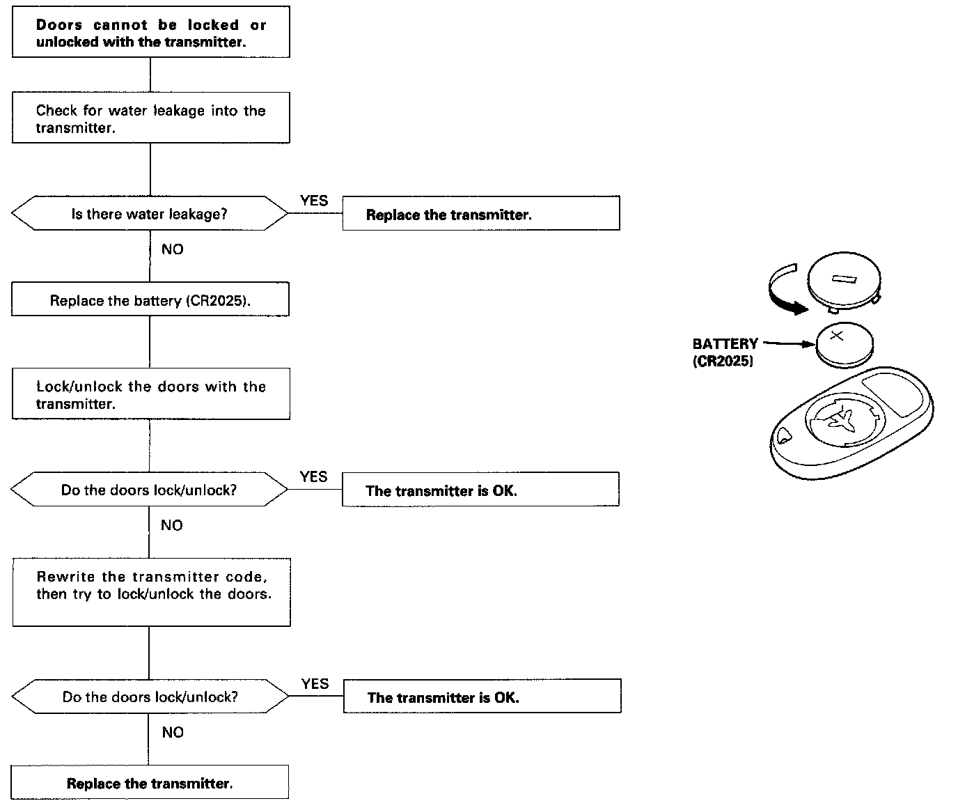 - The doors do not lock or unlock with the transmitter if the ignition key is in the ignition switch.