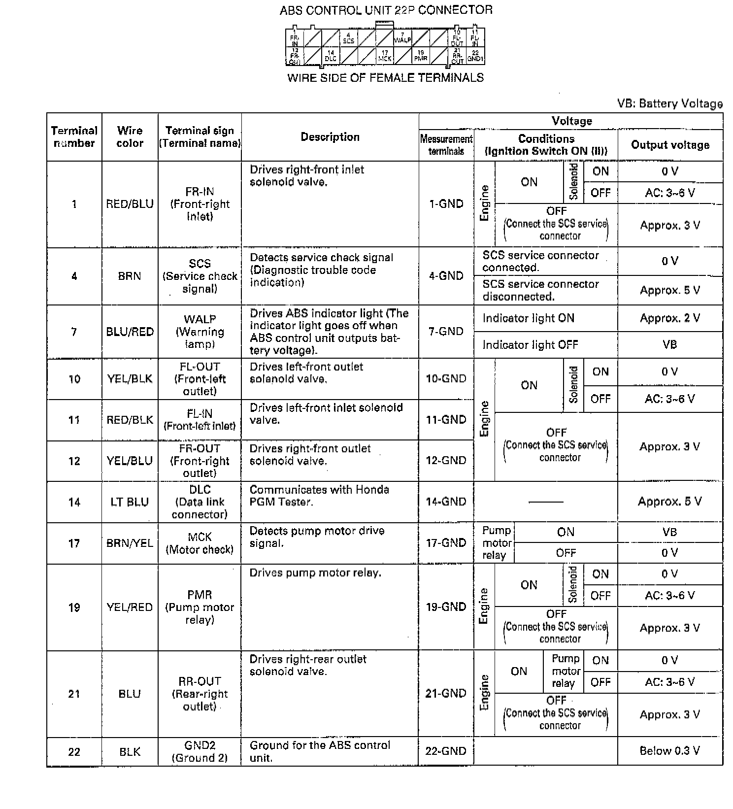 ABS Control Unit (22P) Connector Schematic: