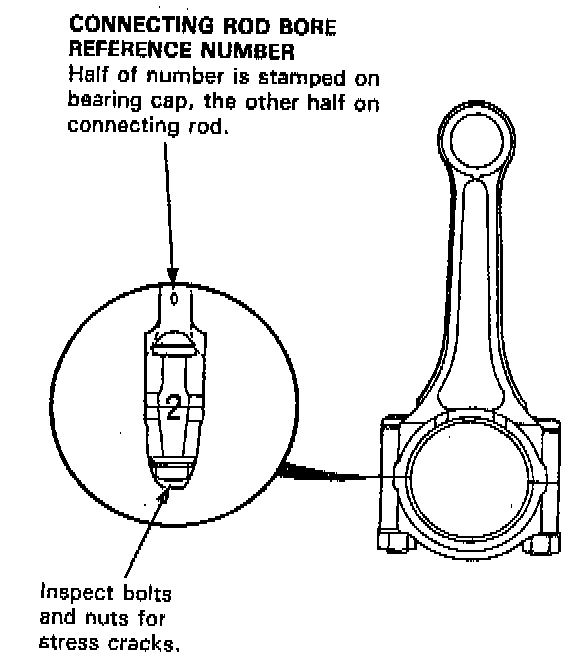 Each rod falls into one of four tolerance ranges (from O to + 0.024 mm (0 to + 0.0009 inch), in 0.006 mm (0.0002 inch) increments) depending on the size of its big end bore. It's then stamped with a number (1, 2, 3, or 4) indicating the range.