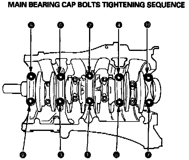 9. Install the main bearing caps. Check clearance with Plastigage, then tighten the bearing cap bolts in 2 steps.