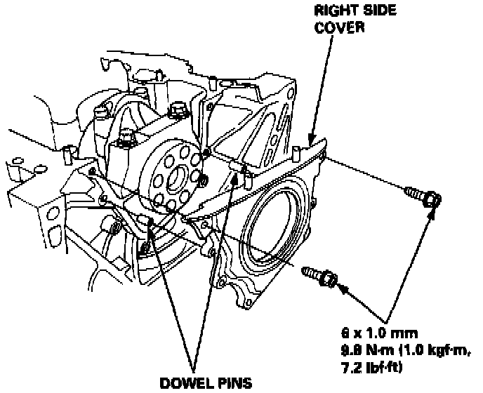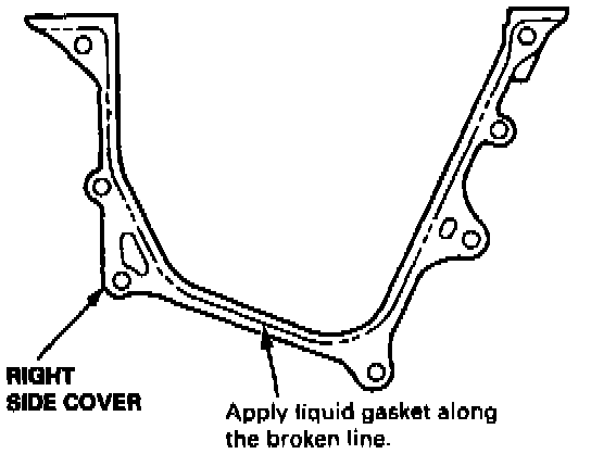 11. Apply liquid gasket part No. 08718-0001 or 08718-0003 evenly to the block mating surface of the right side cover and to the inner threads of the bolt holes. Install it on the cylinder block.
