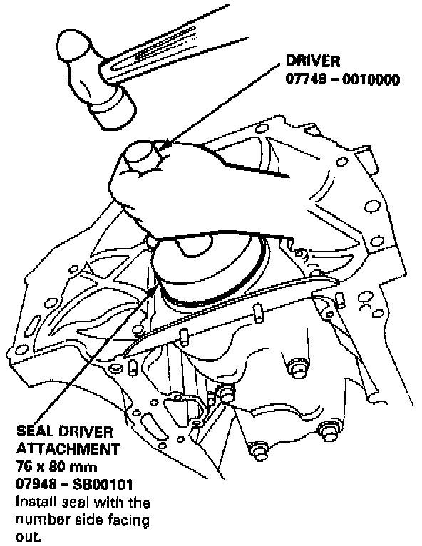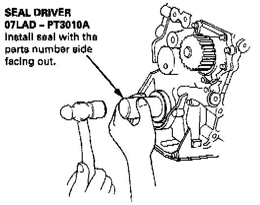 3. Using the special tool, drive in the timing pulley-end seal until the driver bottoms against the oil pump. When the seal is in place, clean any excess grease off the crankshaft and check that the oil seal lip is not distorted.