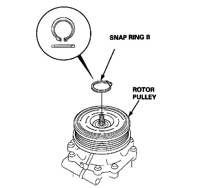 3. Remove the snap ring B with snap ring pliers. Be careful not to damage the rotor pulley and compressor.