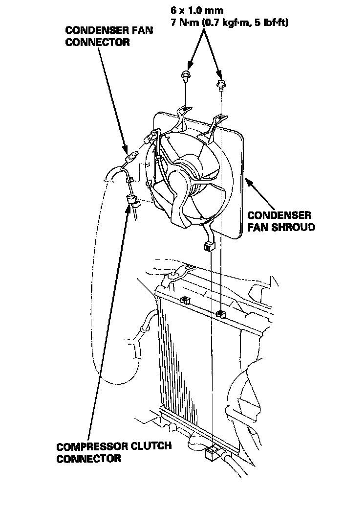 4. Disconnect the condenser fan connector. Remove the compressor clutch connector and the wire harness clip from the condenser fan shroud, then disconnect the compressor clutch connector. Remove the mounting bolts and the condenser fan shroud.