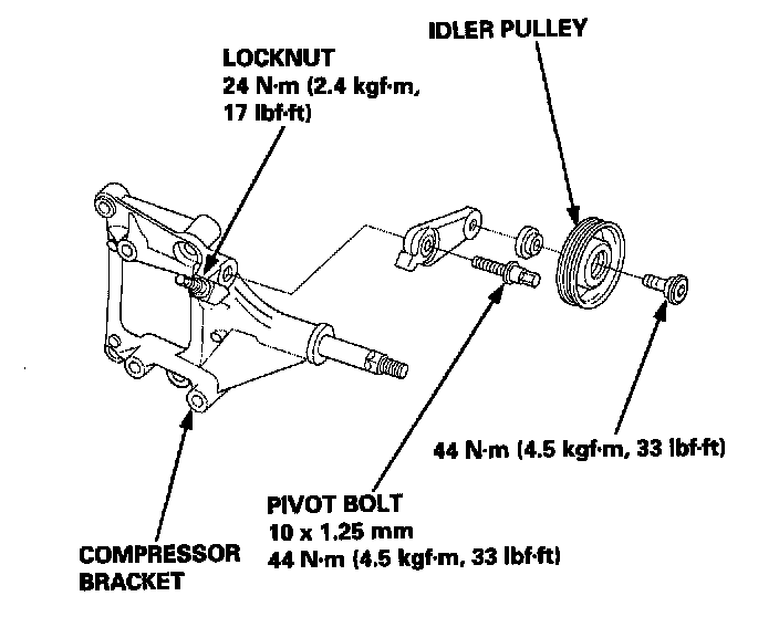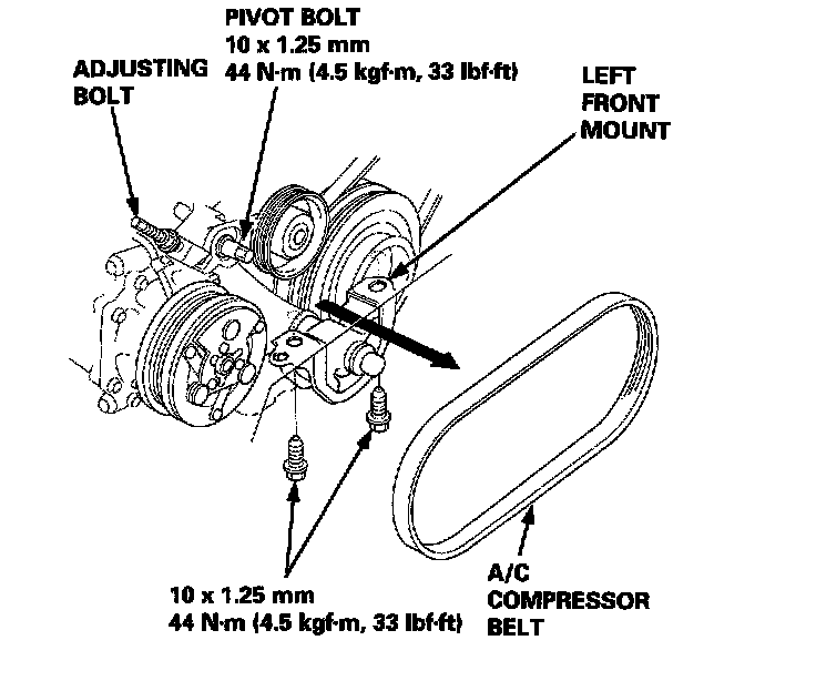 7. Loosen the pivot bolt of the idler pulley bracket and the adjusting bolt, then remove the A/C compressor belt from the pulleys. If necessary, remove the mounting bolts from the left front mount, then remove the A/C compressor belt through the gap between the body and the left front mount.