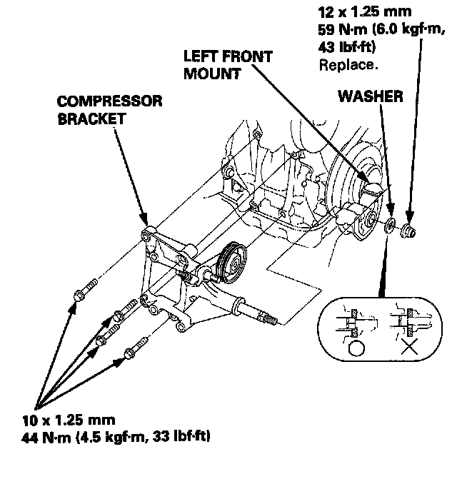 - Remove the nut and the washer from the left front mount. When tightening the nut to the left front mount, make sure the washer is set properly on the left front mount as shown.