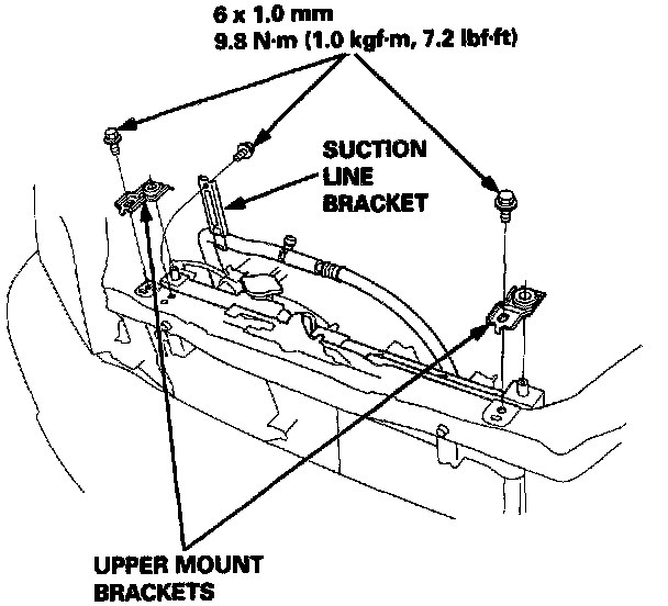 4. Remove the bolts and the suction line bracket as shown. Remove the bolts and the upper mount brackets from the radiator.