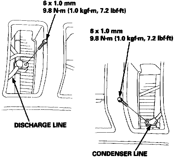 5. Remove each bolt, then disconnect the discharge and condenser lines from the condenser. Plug or cap the lines immediately after disconnecting them to avoid moisture and dust contamination.