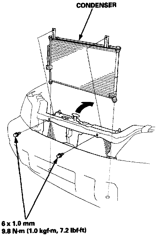 6. Remove the mounting bolts, then remove the condenser by lifting it up as shown. Be careful not to damage the radiator and condenser fins when removing the condenser.