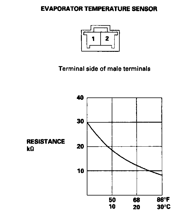 Compare the resistance reading between the No.1 and No.2 terminals of the evaporator temperature sensor with the specifications shown in the following graph; resistance should be within the specifications.