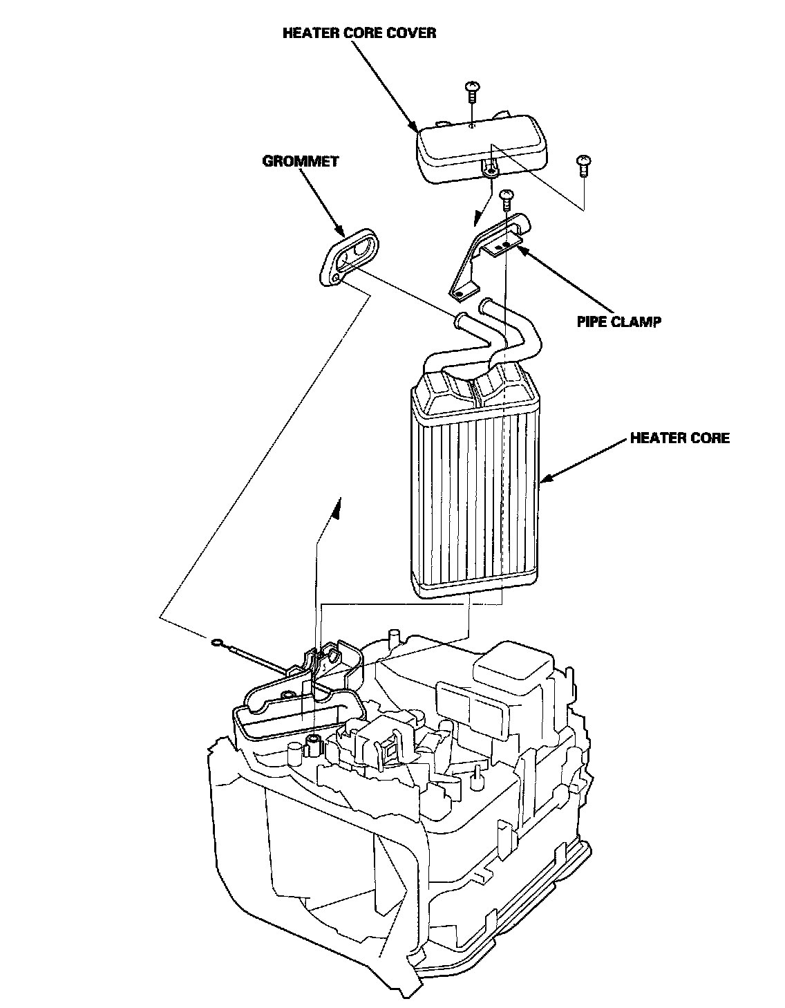 4. Pull out the heater core. Be careful not to bend the inlet and outlet pipes during heater core removal.