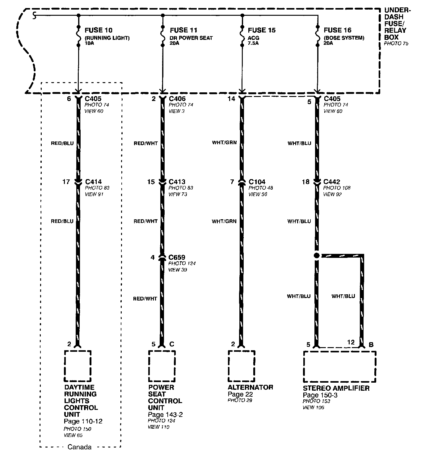 The second half of Power Distribution shows the wiring "From Fuses to Relays and Components." This can speed your troubleshooting by showing which circuits share fuses. If Power Distribution shows that an inoperative circuit and another circuit share a fuse, check a component in the other circuit. If it works, you know the fuse is good and power is available to the inoperative circuit.