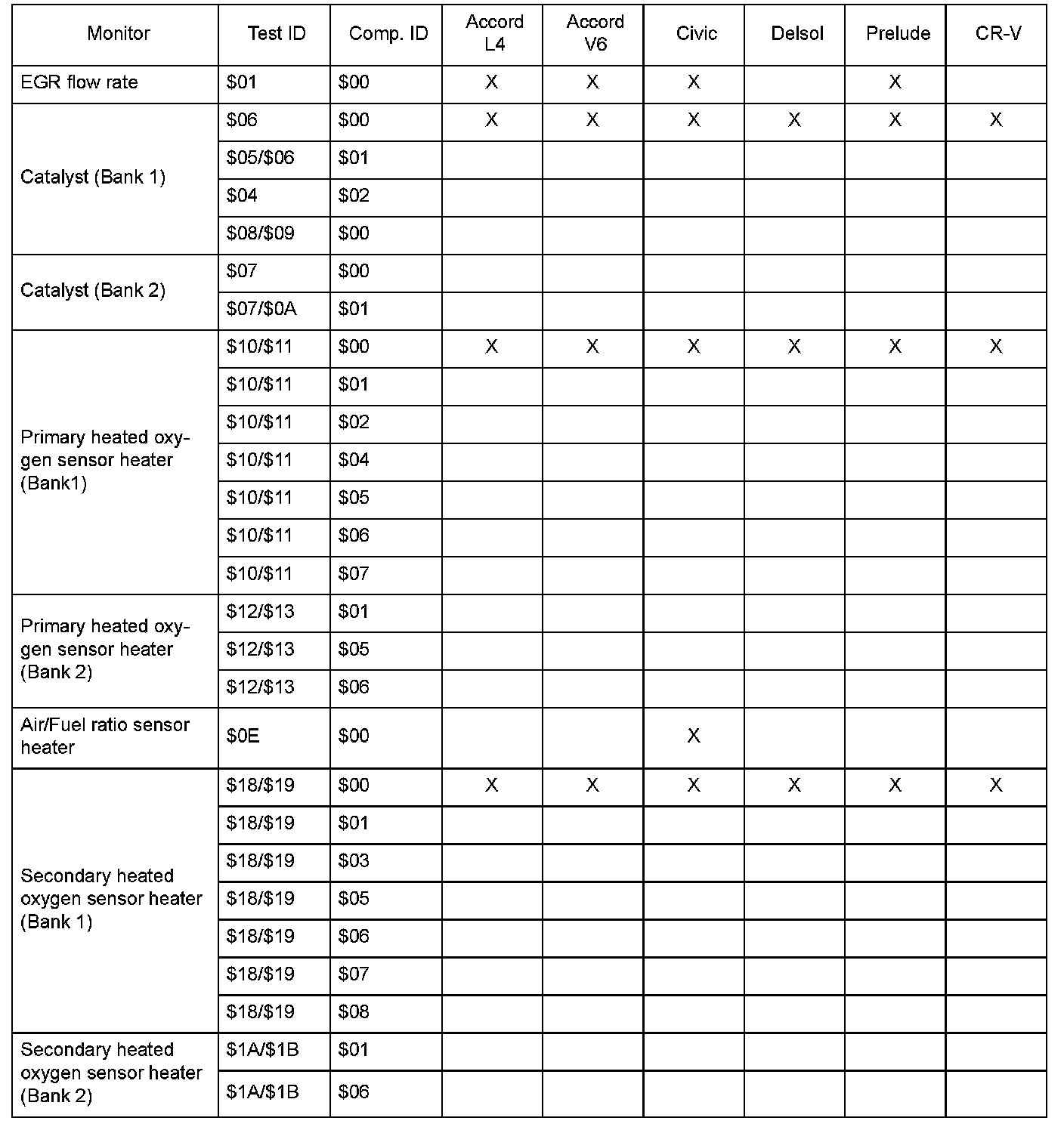 SAE J1979 Mode $06 Test Information: All 1997 Hondas