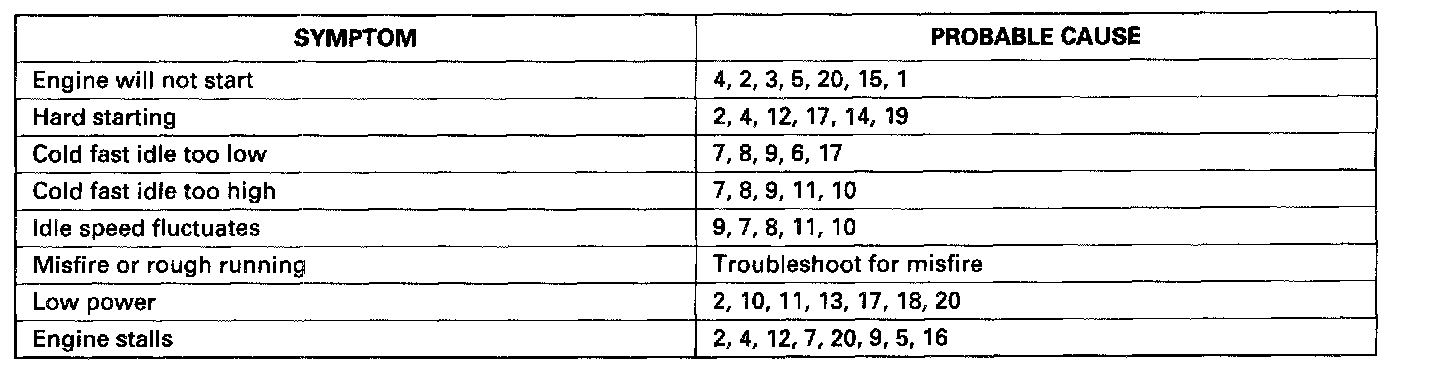 Symptom ChartThe table shows symptoms and probable causes for problems that DO NOT cause the Malfunction indicator Lamp (MIL) to come on. If the MIL was reported on,