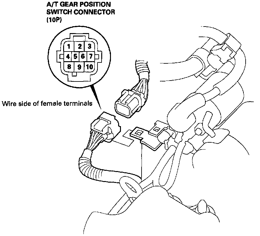 1. Remove the A/T gear position switch connector from the connector bracket, then disconnect the A/T gear position switch connector (10P).