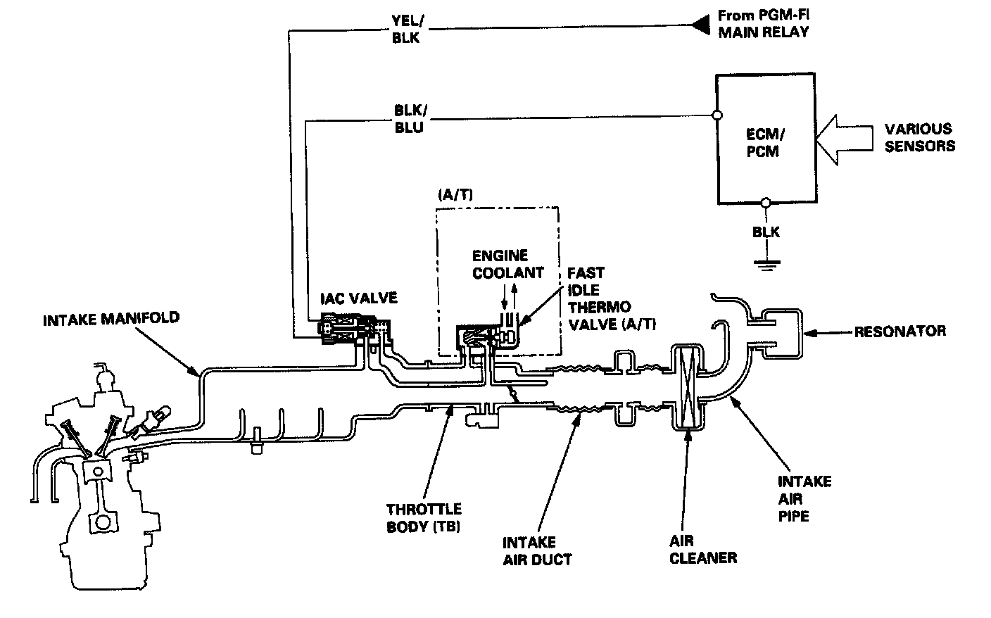 The system supplies air for all engine needs. It consists of the intake air pipe, Air Cleaner, intake air duct, Throttle Body (TB), Idle Air Control (IAC) Valve, fast idle thermo valve, and intake manifold. A resonator in the intake air pipe provides additional silencing as air is drawn into the system.