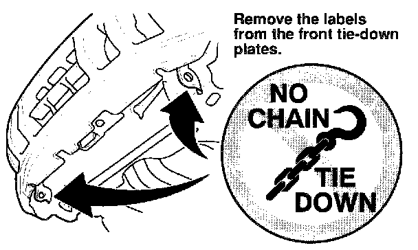 Remove the labels attached to the front tie-down plates. This label applies during transportation to the dealer. These tie-down plates can be used when transporting the CR-V on a flatbed tow truck.