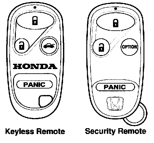 A keyless entry system is standard on the EX model and optional on the LX model. A security system (with keyless entry) is available as optional equipment on both models. When working with the CR-V, be sure you know which system is installed on the vehicle that you're working on. The remotes look very similar but are not interchangeable. A way to tell if the vehicle has a Genuine Honda Security System is to look for the LED mounted on the top of the steering column cover.