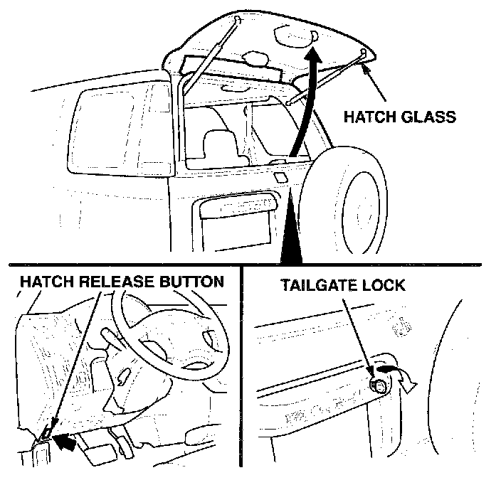 The tailgate is a two-piece construction (hatch glass and tailgate door). The hatch glass can be opened in one of three ways:
