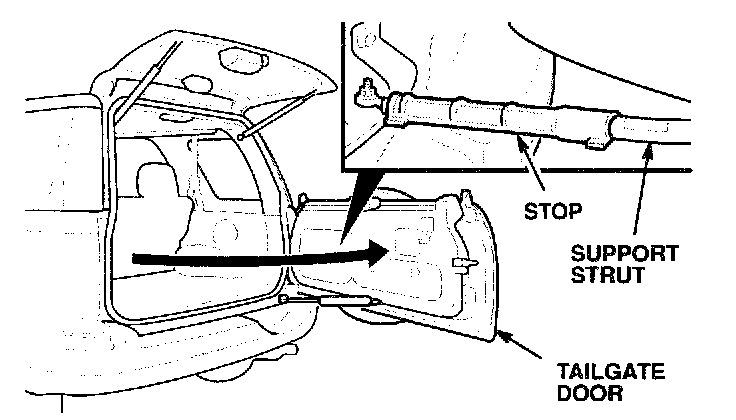 A support strut is used to keep the tailgate door from opening too fast, and to help hold the door open. In strong winds or when parking on a slope, place the stop over the support strut to hold the tailgate door. The stop is packaged with the front license plate holder, and the stop should be stored in the right cargo floor pocket with the tool kit.