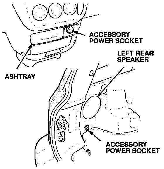 Two accessory power sockets are standard on the CR-V. One socket is located in the dashboard by the ashtray and the other socket is in the rear cargo area below the left rear speaker. Each socket can operate a 12-volt accessory that is rated up to 120 watts or less (10 amps). The sockets are only usable when the ignition switch is in the ACCESSORY (I) or the ON (II) positions. The sockets will not power an automotive cigarette lighter element.
