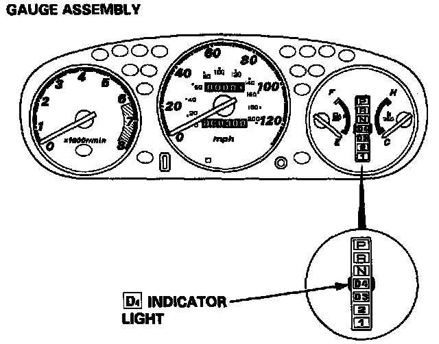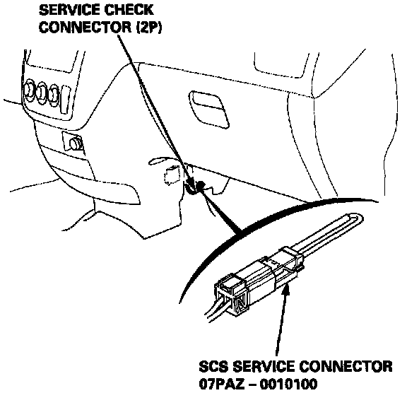 When the PCM senses an abnormality in the input or output systems, the [D4] indicator light in the gauge assembly will blink. When the Service Check Connector (2P) (located under the dash on the passenger side) is connected with the special tool as shown, the [D4] indicator light will blink the Diagnostic Trouble Code (DTC) when the ignition switch is turned ON.